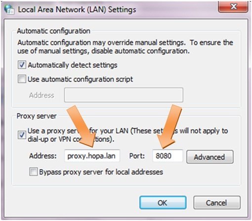 Nástroje > Možnosti siete internet > Pripojenia > Nastavenia siete LAN > Zmeniť nastavenia proxy > Nastavenia LAN > Použiť nastavenie proxy pre sieť LAN (zaškrtnúť) > Adresa (napísať: proxy.hopa.lan) > Port (napísať: 8080) > potvrdiť (OK)